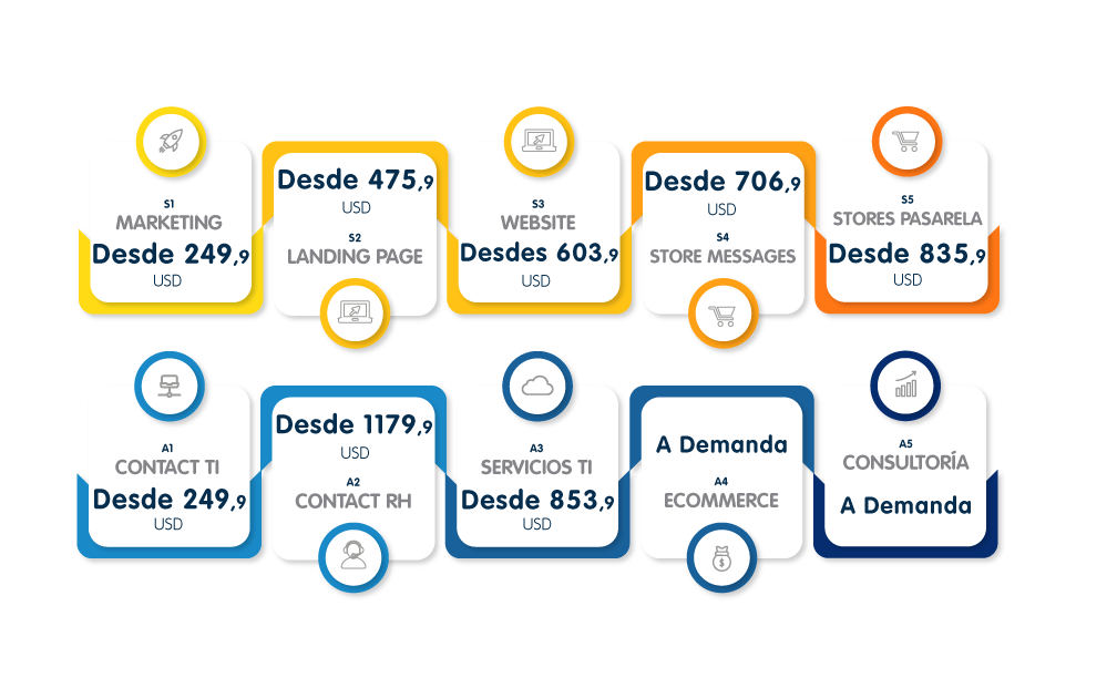 Los planes starters para empresas principiantes que apenas van a incursionar en el en mercado digital y planes avanzados para empresas que desean sacar todo el provecho al mercado digital.
